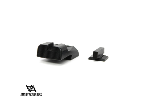 Fixed blank sights with grooved front sight and grooved rear sight.